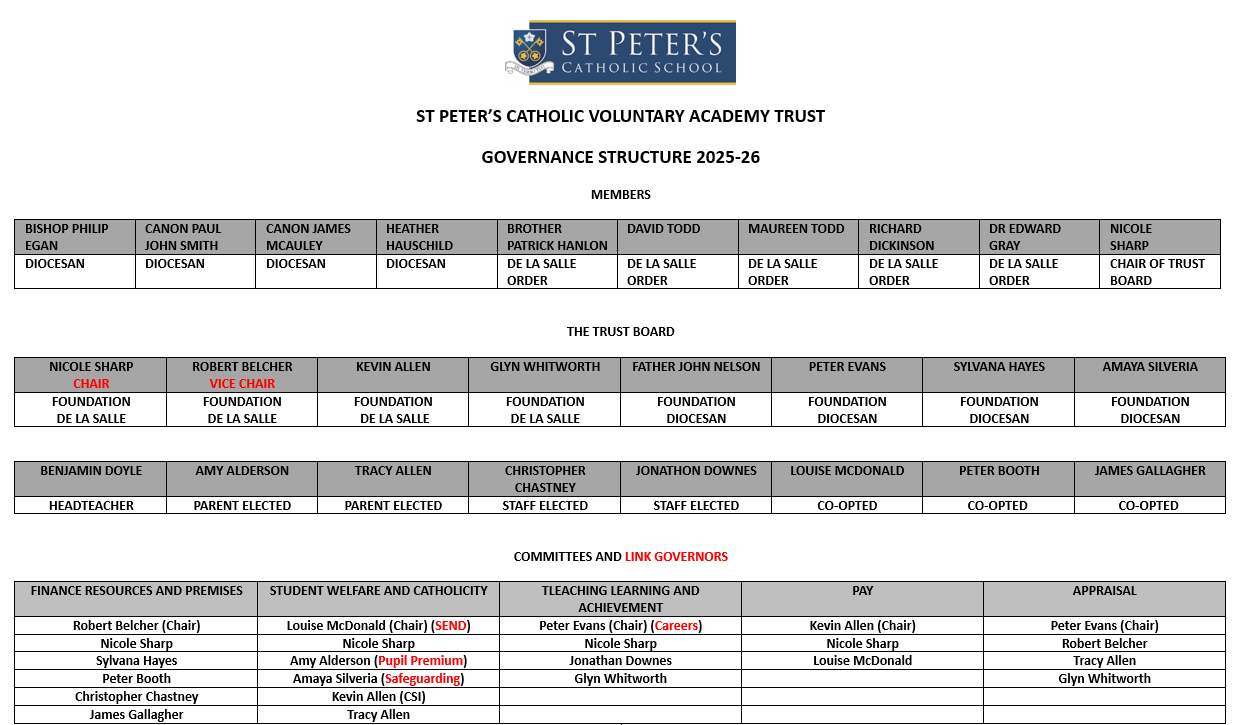 In an academy “trustees” fulfil the roles traditionally fulfilled by governors. At St Peter’s trustees are usually still referred to as governors. Academies have the legal status of companies and are also charitable trusts meaning that trustees have the responsibilities of both company directors and charity trustees. They must have the best interests of the academy uppermost in their minds at all times and have a duty of compliance, ensuring all relevant laws and regulations are followed.